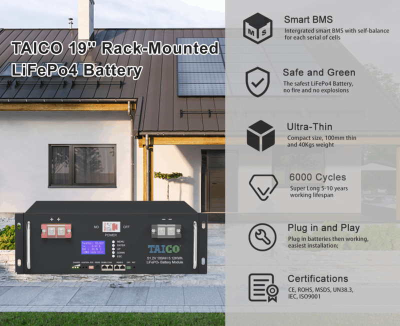 Each model in the Taico series boasts impressive performance specs, including a maximum charging and discharging current of 100A and a maximum power output ranging from 2400W to 12800W. With a lifetime of 10 years and up to 6000 cycles at 80% depth of discharge (DOD), these batteries are built to last and deliver consistent performance over time.
